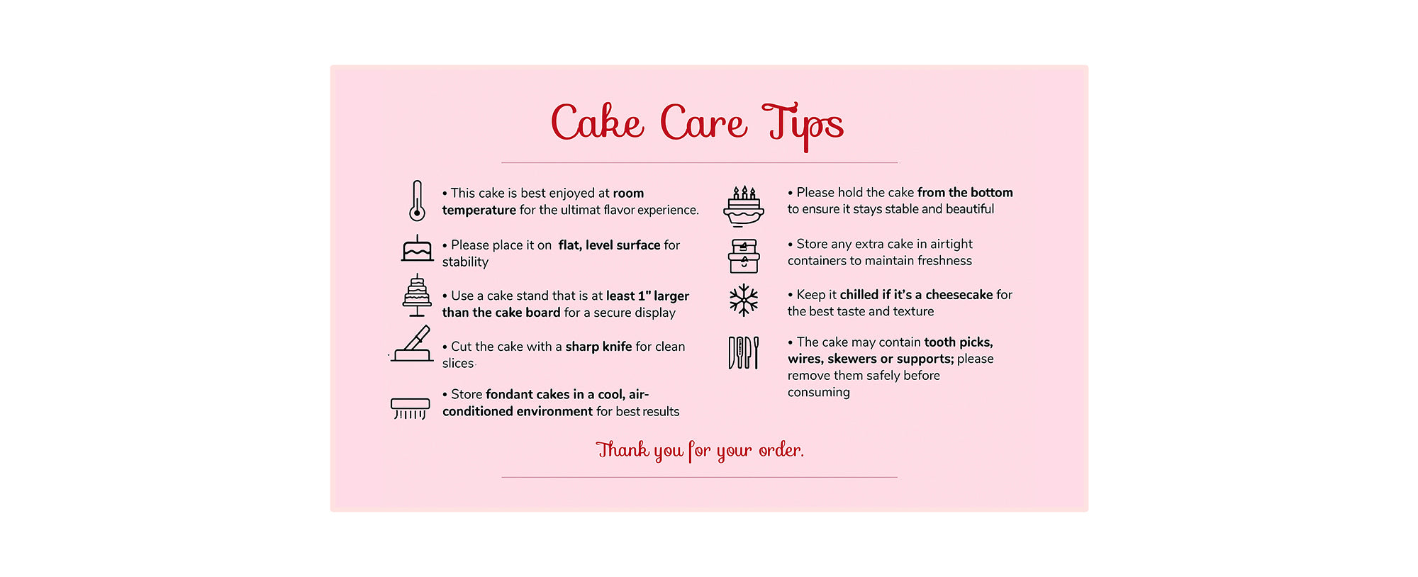 We recommend placing custom cake orders at least 2–3 days in advance, especially for detailed designs or larger cakes.